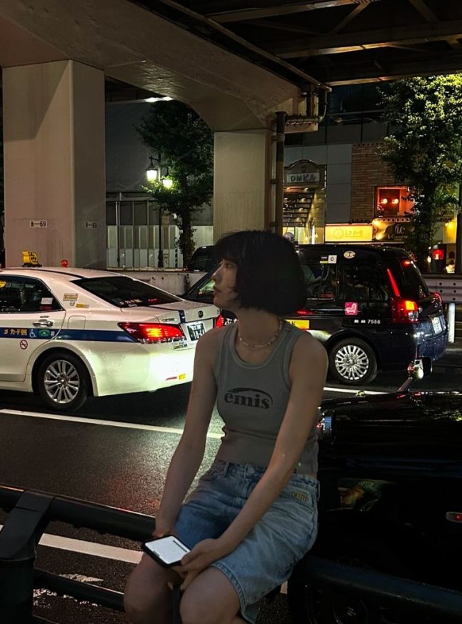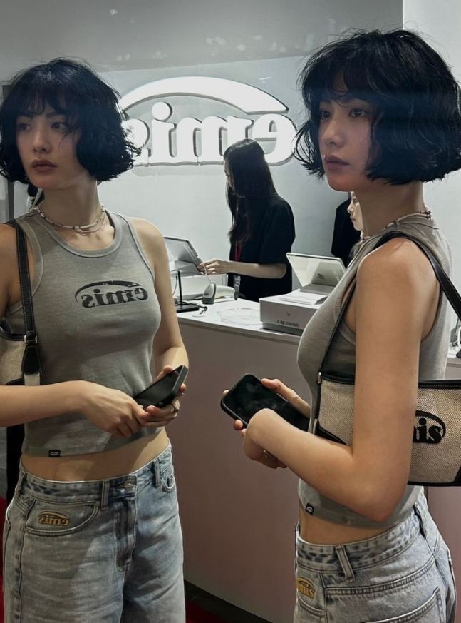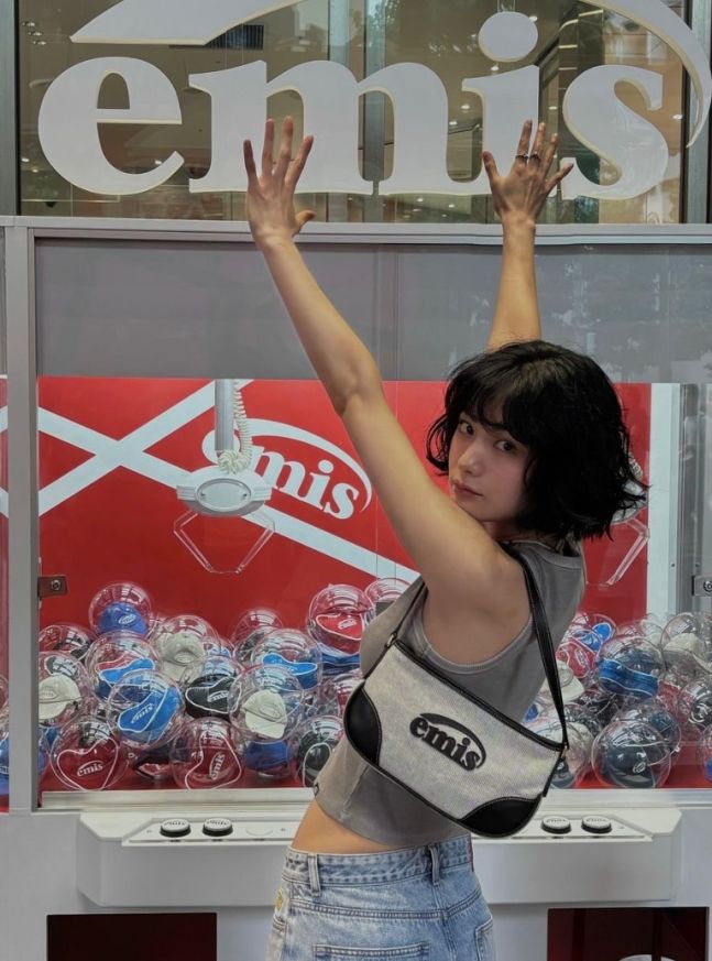 특히 눈길을 끄는 건 역시 헤어스타일입니다. 턱선에 맞춘 짧은 흑발 단발에 굵은 웨이브를 넣어 몽환적이면서도 소년미 넘치는 분위기를 연출했는데요. 여기에 빈티지한 비즈 목걸이와 emis 로고가 박힌 숄더백을 매치해 '힙'한 Y2K 감성을 완벽하게 소화해냈습니다.